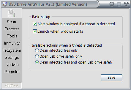 | Setup the alert window and autostart of USB Drive AntiVirus. | ||